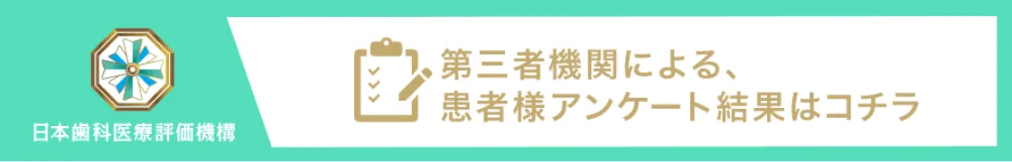 少しでも患者様にとってより良い⻭科医療を提供するため、 第三者機関のNPO法人 日本⻭科医療評価機構に依頼をし、患者様の満足度調査を行っています。 患者様の率直なご意見をいただき、 改善すべき点は真摯に受け止めていきたいと思っています。当院には患者様の個人情報は一切伝えられませんので、是非、皆様の忌憚のないご意見をお聞かせください。NPO法人日本⻭科医療評価機構の調査結果はバナーよりご確認ください。