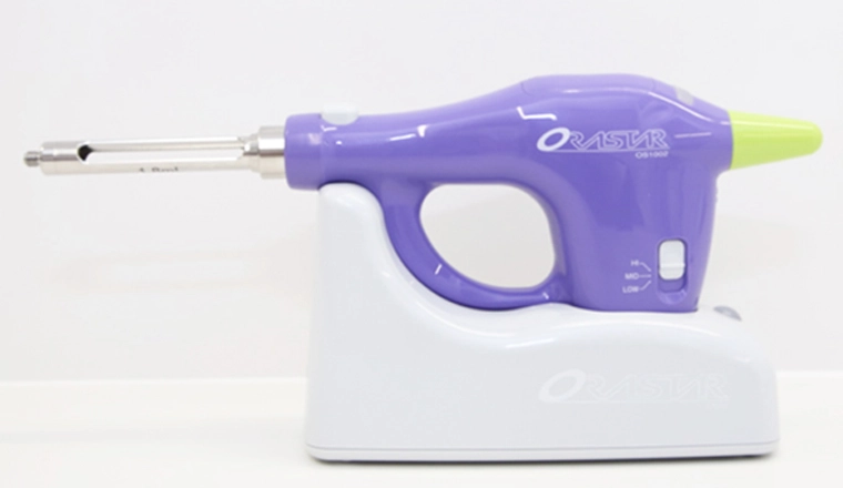 注射時の痛みは注入する速さによる圧力が影響するため、人の手で行う注射では加圧のムラが生じ、痛みを感じる原因になります。電動麻酔注射器は、コンピュータで制御された機器により、ゆっくりと痛くないように一定のスピードで麻酔液を注入することができます。また、手動で注射を行なう場合より細い針を使用しているため、刺したときの痛みも抑えることが可能です。