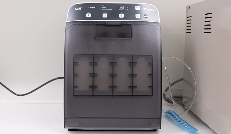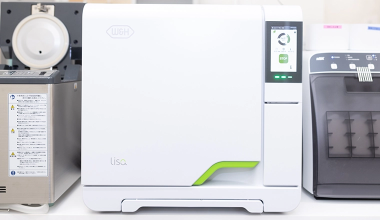 当院では、歯を削る際に使用するタービン(ハンドピース類)も専用の滅菌器を使い、お客様ごとに器具の滅菌処理を行っています。専用機器ならではの徹底した洗浄・滅菌により、内側の細部に至るまで理想的な滅菌処理が可能となり、細菌やウイルスを排除し治療の安全性を高めます。