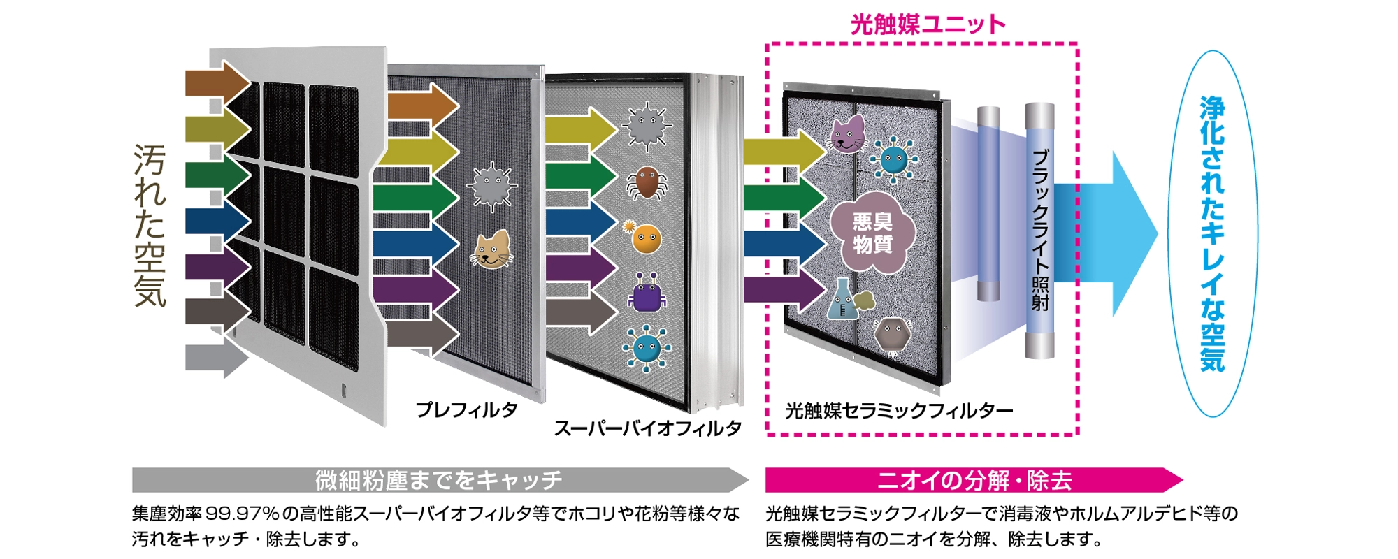 特殊な光触媒セラミックフィルターを搭載し、新型コロナウイルスやインフルエンザウイルスをはじめ、さまざまなウイルスや菌、花粉やニオイ等も除去し、理想的な院内空気環境を作り出せる高性能の空気浄化システムです。